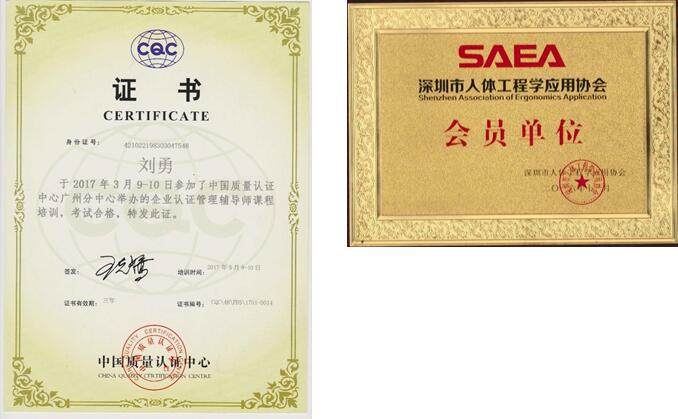 ISO 9001質量管理體系、ISO 14001環境管理體系、OHSAS 18001職業健康安全管理體系、ISO13485醫療器械質量認證管理體系、TS16949汽車行業質量管理體系認證、QC080000、中國環境標志認證(十環)、CQC環保認證、企業信用評價AAA級信用企業、RoHS、CE、REACH、FCC等證書、人類工效學認證、家具中有害物質限量認證證書、家具定制服務認證、綠居材3G認證、FSC-COC/PEFC森林認證、綠色建材產品證書